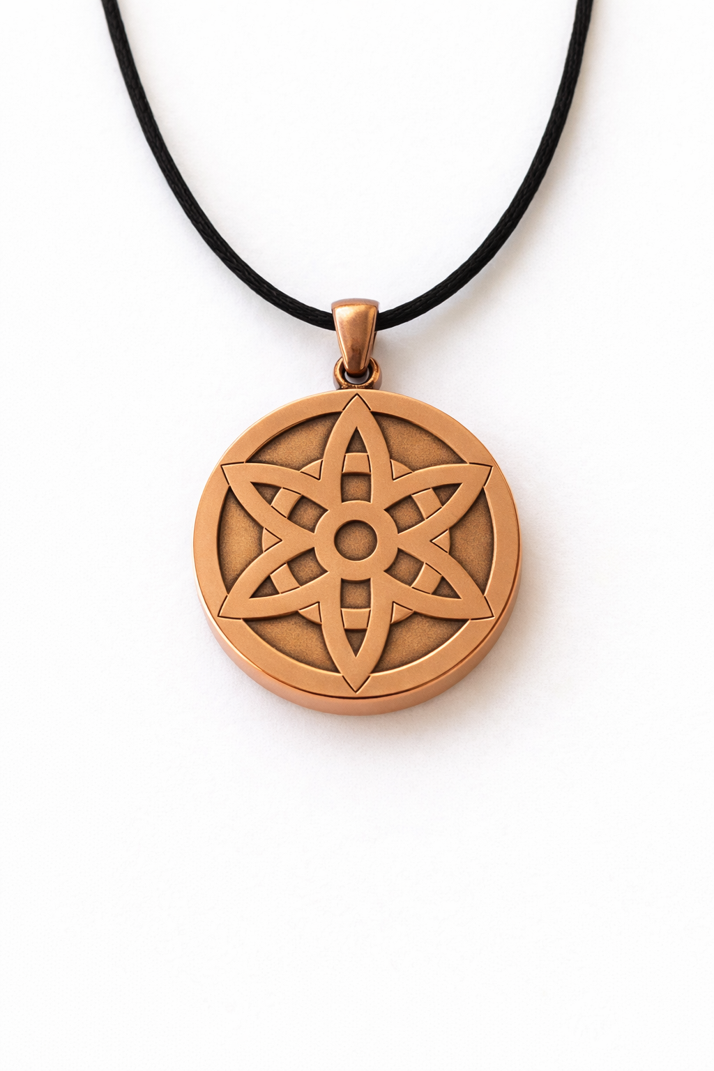 The Biofield Resonator™ Pendant is a precision-crafted geometric medallion designed to support coherence within the human biofield while being worn on the body. It integrates sacred geometry, physics-inspired form, material science, and embedded Quantum K harmonics into a functional pendant that serves simultaneously as a personal resonator, protective interface, and educational model of universal structure.